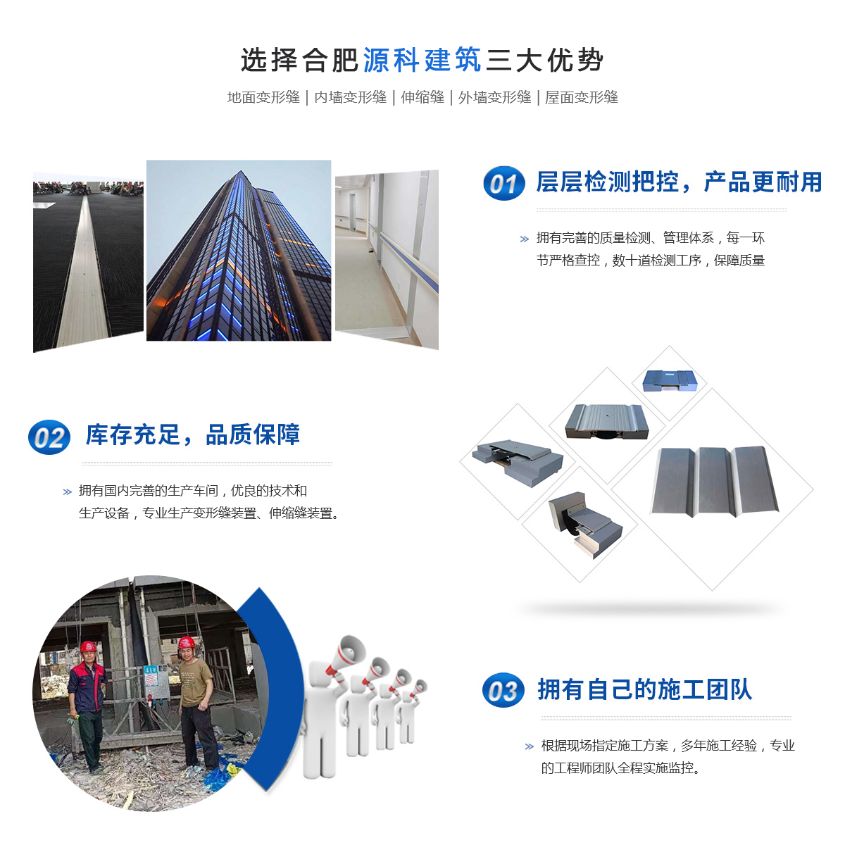 合肥源科建筑科技有限公司位于長三角城市群副中心的合肥,面向國內(nèi)外生產(chǎn)銷售是專業(yè)研發(fā)及產(chǎn)銷各種建筑伸縮縫、地面變形縫、內(nèi)外墻變形縫等裝置。參與了省內(nèi)大型工程(醫(yī)院、學(xué)校、工廠、大型商場超市等)建設(shè),是諸多建設(shè)單位和設(shè)計(jì)學(xué)院長期合作單位,在建筑變形縫伸縮縫行業(yè)樹立了自己的專業(yè)形象。本公司根據(jù)建筑業(yè)的發(fā)展和用戶的實(shí)際需要,深入研制出目前國內(nèi)新型的建筑伸縮縫裝置。按照使用部位分為四個(gè)類別:樓地面變形縫;內(nèi)墻、頂棚吊頂變形縫;外墻變形縫;屋面變形縫;按照變形...